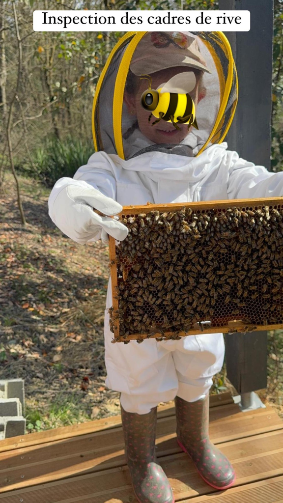 Notre fille Lina 5 ans est passionnée par les abeilles et prend part aux activités sur le rucher.