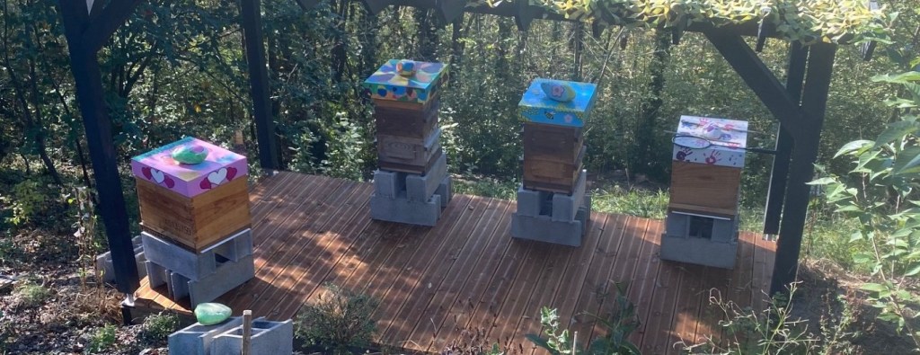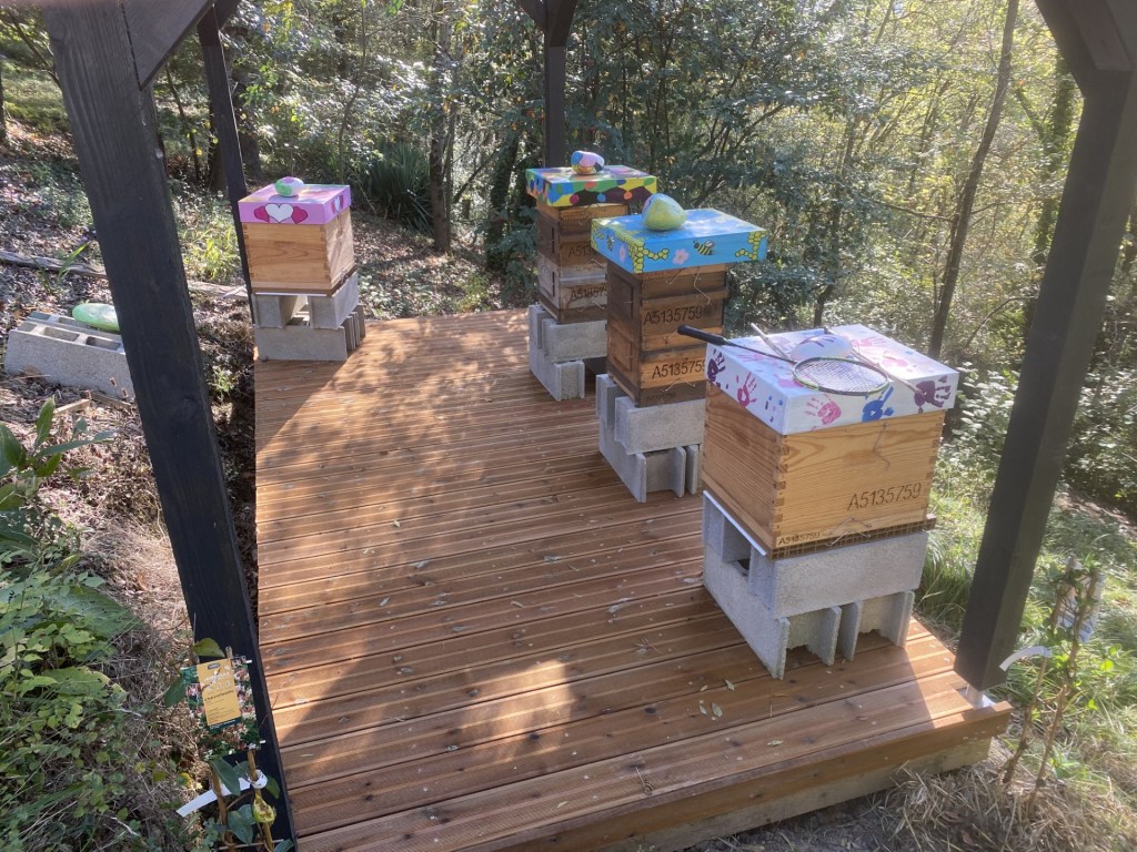 Le rucher de développement est composé de 2 ruches Dadant et de 2 ruches Warré.